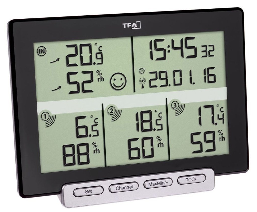 Součástí přístroje jsou již v základní výbavě 3 čidla (TFA 30.3221.02). Přístroj nadále disponuje funkcemi jako je paměť na minimální/maximální naměřené veličiny, symbolová indikace vlhkostní pohody (sucho, komfort, vlhko) a vývoje vnitřní teploty/vlhkosti (klesá, stoupá, nemění se).