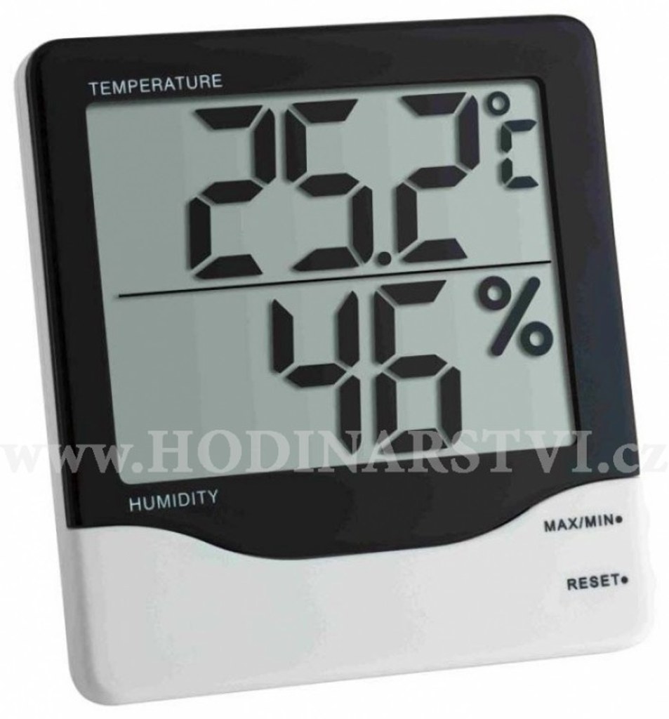 Digitální teploměr s vlhkoměrem TFA 30.5002 měří pokojovou teplotu a vlhkost. V horní části displeje je zobrazena teplota a ve spodní vlhkost vzduchu. Přístroj si pamatuje naměřené min. a max. hodnoty od posledního manuálního resetování. Teplotu lze zobrazit ve °C, nebo °F. Je možné jej zavěsit na zeď či postavit na rovnou podložku díky výklopnému stojánku.