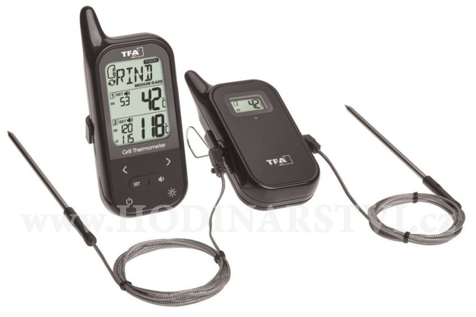 - K optimální přípravě masa a drůbeže, použitelný pro grily a pečící trouby. - Vysílač se dvěma vpichovými sondami z nerezové oceli a kabelem dlouhým cca 1 m a dosahem max. 100 m . - Možnost sledovat teplotu uvnitř grilu nebo trouby pomocí dvou sond - Možnost nastavení horního a spodního teplotního alarmu nebo cílové teplotu max 2 kusů připravovaných mas (grilování, pečení) - Ideální také pro sledování vaření při nízkých teplotách - Předprogramované nastavení pro různé typy masa a stupně vaření (v němčině nebo angličtině): hovězí, telecí, jehněčí, vepřové, kuřecí, krůtí, ryba a hamburger/propečený, střední, středně propečený a krvavý steak - Nastavitelné vlastní hodnoty teplot - Zvukový alarm při dosažení určité teploty - Podsvícení displeje