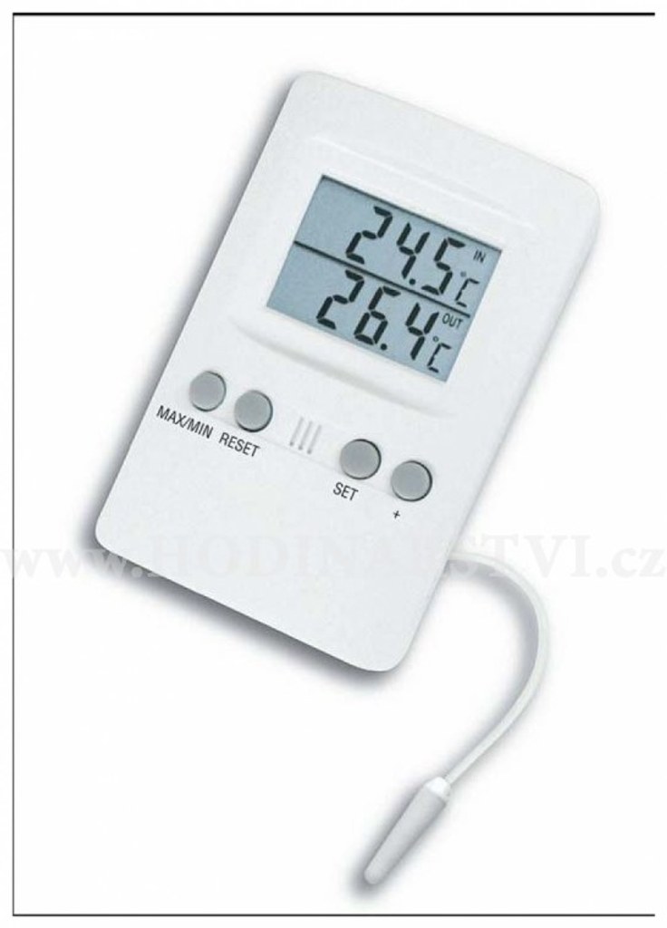 Digitální teploměr TFA 30.1024 s nastavitelným zvukovým ALARMEM a kabelovým čidlem měří vnitřní i venkovní teplotu, zaznamenává minimální a maximální teploty do své vnitřní paměti.