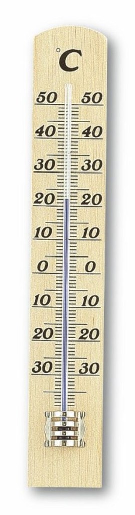 Kapalinový teploměr z bukového dřeva vhodný do interiéru. Vlastnosti: Rozsah měření: -38°C až +50°C Rozměry: 31 x 16 x 180 mm Hmotnost: 34 g