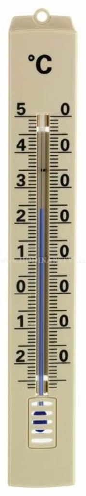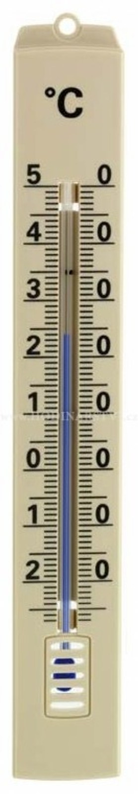 Plastový závěsný kapalinový teploměr hnědé barvy je vhodný jak pro měření teploty venku, tak i v pokoji.