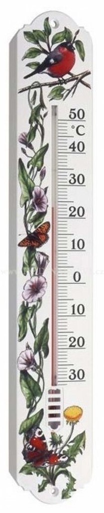 Plastový závěsný kapalinový teploměr s motivem ptáků a květin je vhodný jak pro měření teploty venku, tak i v pokoji.