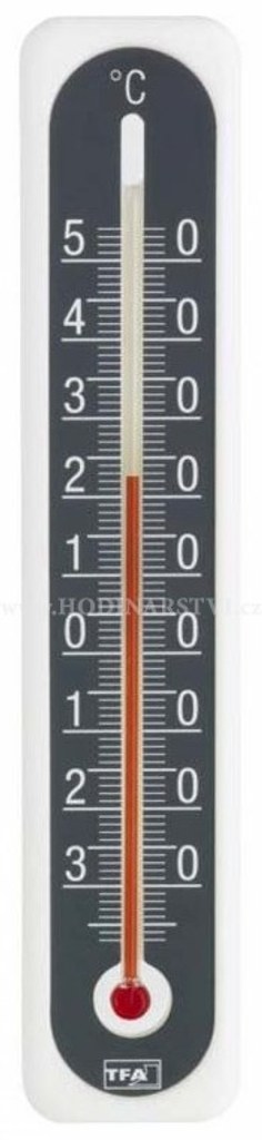Plastový závěsný kapalinový teploměr bílé/šedé barvy je vhodný jak pro měření teploty venku, tak i v pokoji.