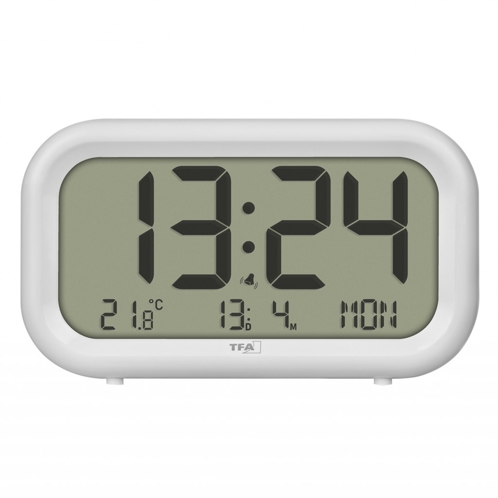 Budík TFA 60.2052 NOCTA kombinuje velké číslice času s dalšími dodatečnými informacemi v druhém řádku displeje.