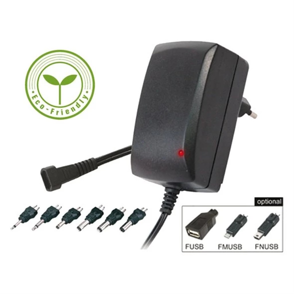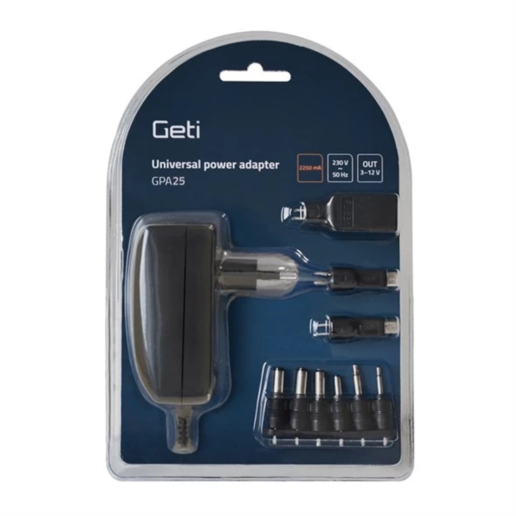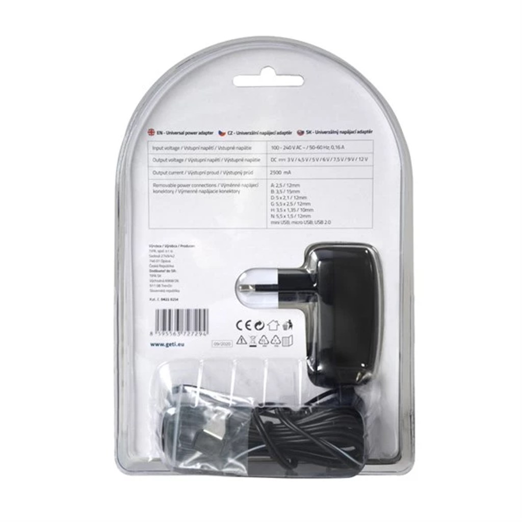 Energeticky úsporný pulsní stabilizovaný univerzální spínaný síťový napájecí adaptér - napáječ GPA25 zdroj napájení digitálních fotoaparátů, přehrávačů CD, MP3 apod. Změna polarity je možná otočením konektoru. Výměnné napájecí konektory. Otočný přepínač pro nastavení napětí. Spotřeba el. energie ve stavu bez zátěže je do 0,3W.
