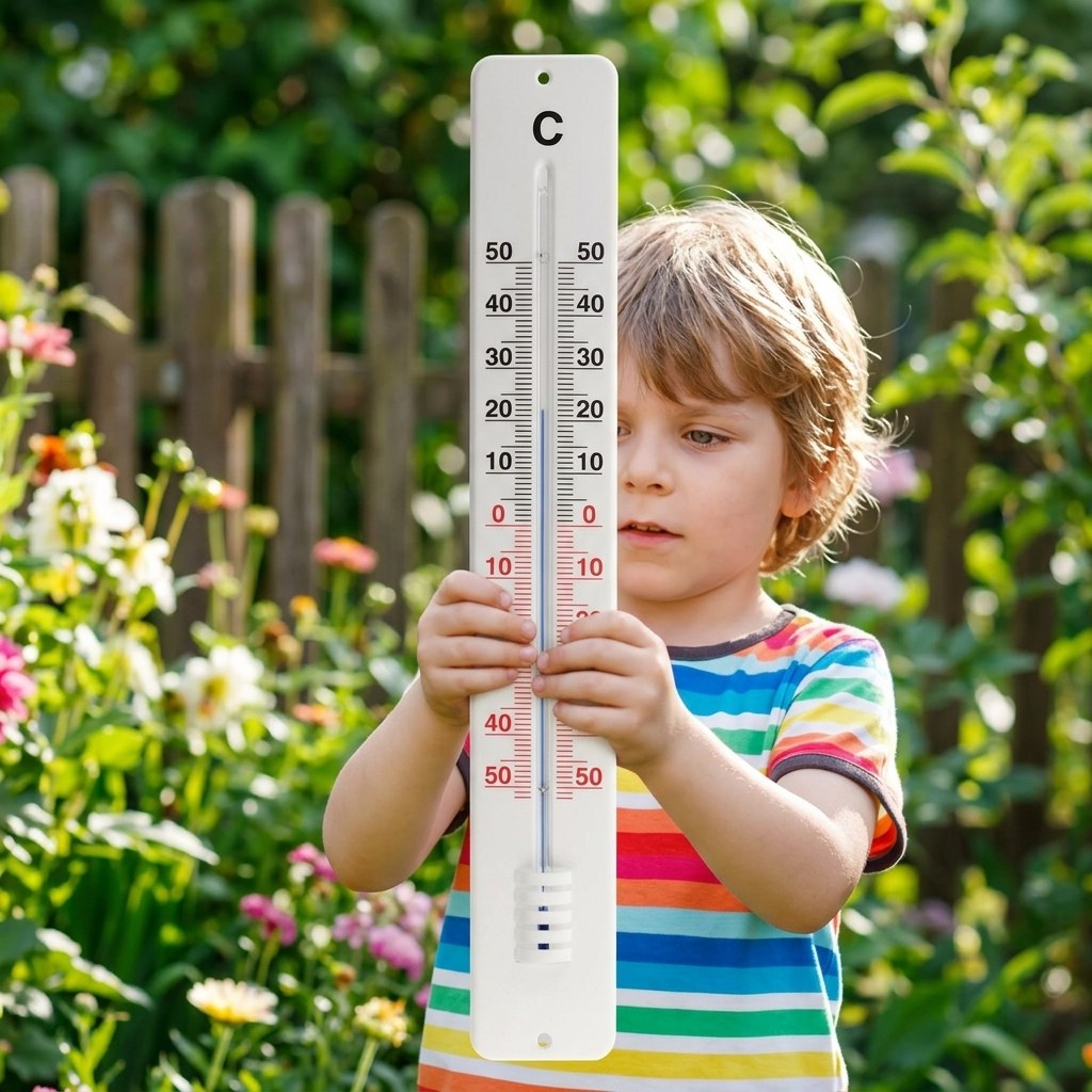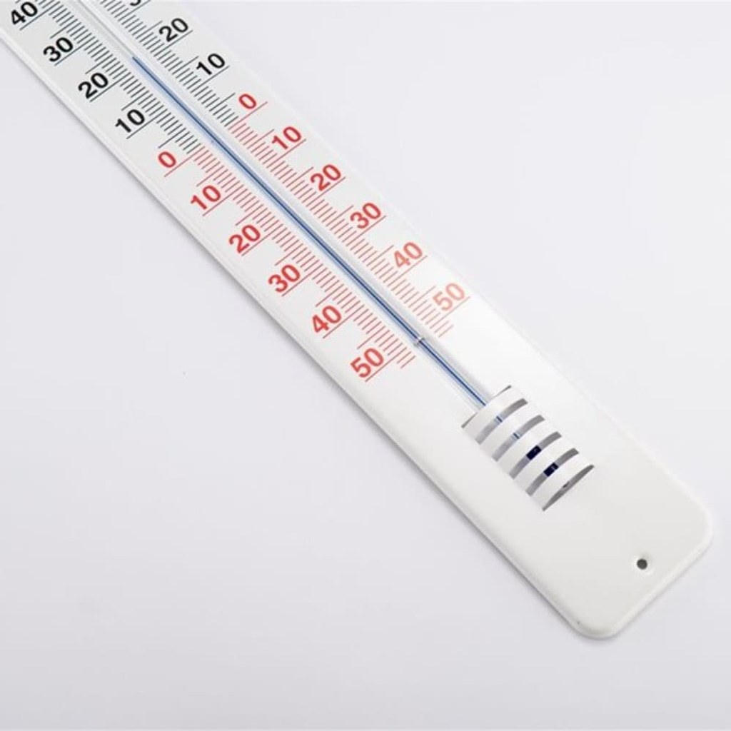Velký kovový nástěnný teploměr s povrchovou úpravou - smalt. Barva bílá.