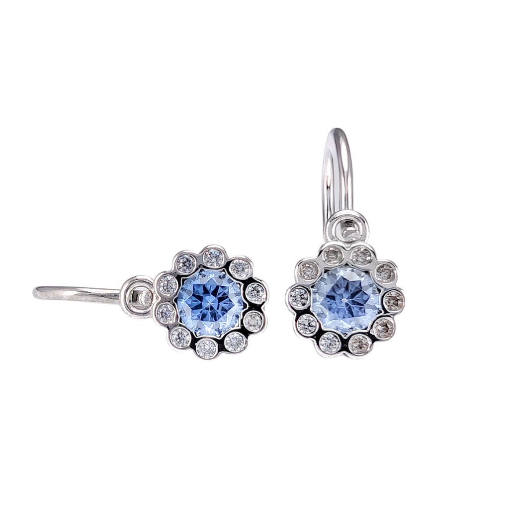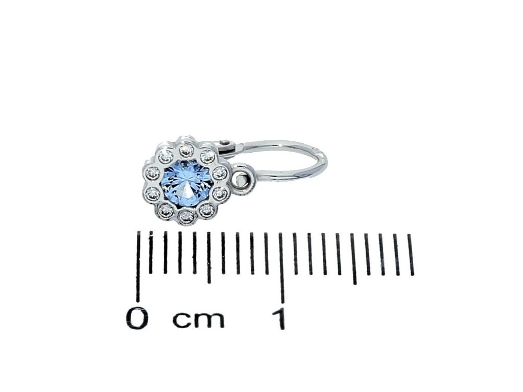 Zlaté náušnice z bílého zlata ve tvaru kytičky, zdobené bílými zirkony a modrým středovým zirkonem.