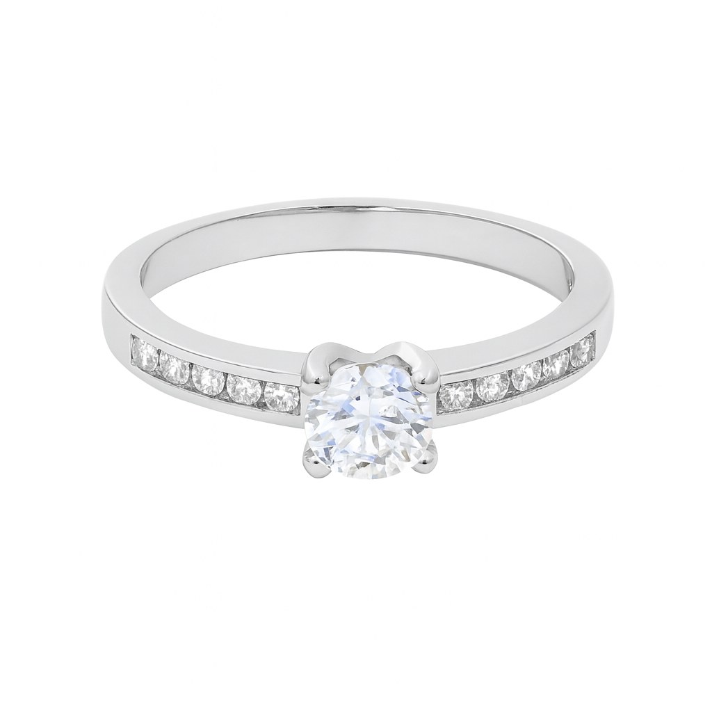Zlatý prsten z bílého zlata osázený bílými zirkony briliantového brusu